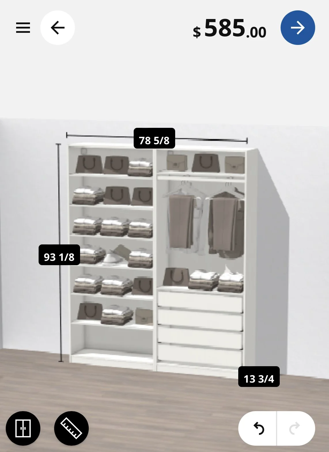 I did a great job maximizing space in my narrow closet, but it’s not enough, I simply have too much stuff I’m not ready to part with, so I’m adding a floor-to-ceiling PAX wardrobe from IKEA to keep shoes, linens, out of season clothes and more. I’m still in the process of researching how to do this kind of build, but in the meantime, I’m playing around with the Pax Planner tool to get the right configuration.